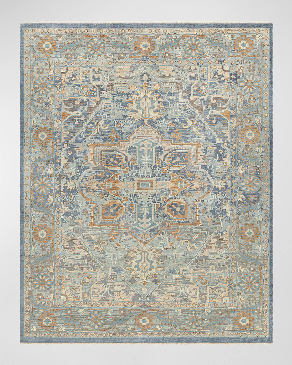 Traditional rug is handcrafted of wool Rug measures approx. 7'9" x 7'9" Low pile Rug height: 0.25" Fringe length: 0.5" Item Weight (Lbs.): 50.0 Vacuum regularly; professional clean only Size is approximate; we recommend use of a rug pad (not included) Imported