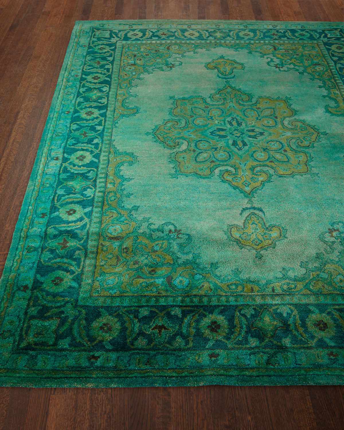 Traditional rug. Made of handknotted wool; featuring low pile and antique wash. Overdyed with lustrous sheen. All sizes approximate. Imported.