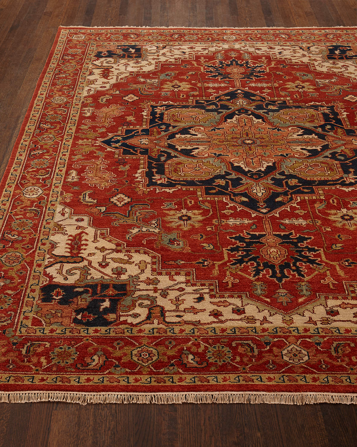 The Standish rug showcases a traditional inspired design that exemplify timeless styles of elegance, comfort, and sophistication. Made with New Zealand Wool in India, with fringe detail. The rug height is approximately 0.59" Handknotted rug. Medium pile Size is approximate. Imported.
