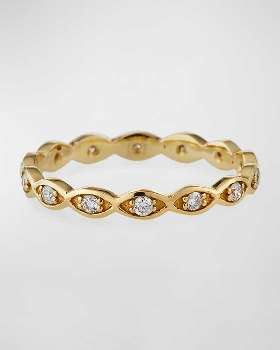 Sydney Evan band ring in 14karat yellow gold. Round white diamonds at evil eye stations. 0.21 total diamond carat weight. Approx. 1/8"H x 3/4"W. Imported.