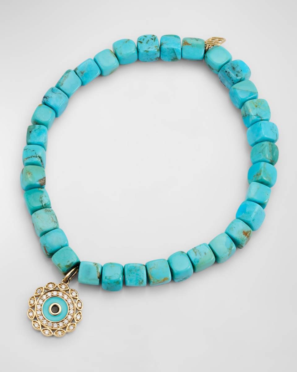 Sydney Evan beaded bracelet Approx. 6.25" circumference 14karat yellow gold Evil Eye pendant and connector Turquoise cubes and inlay 30 white diamonds 0.15 total carat weight Stretches to fit Slipon style Imported