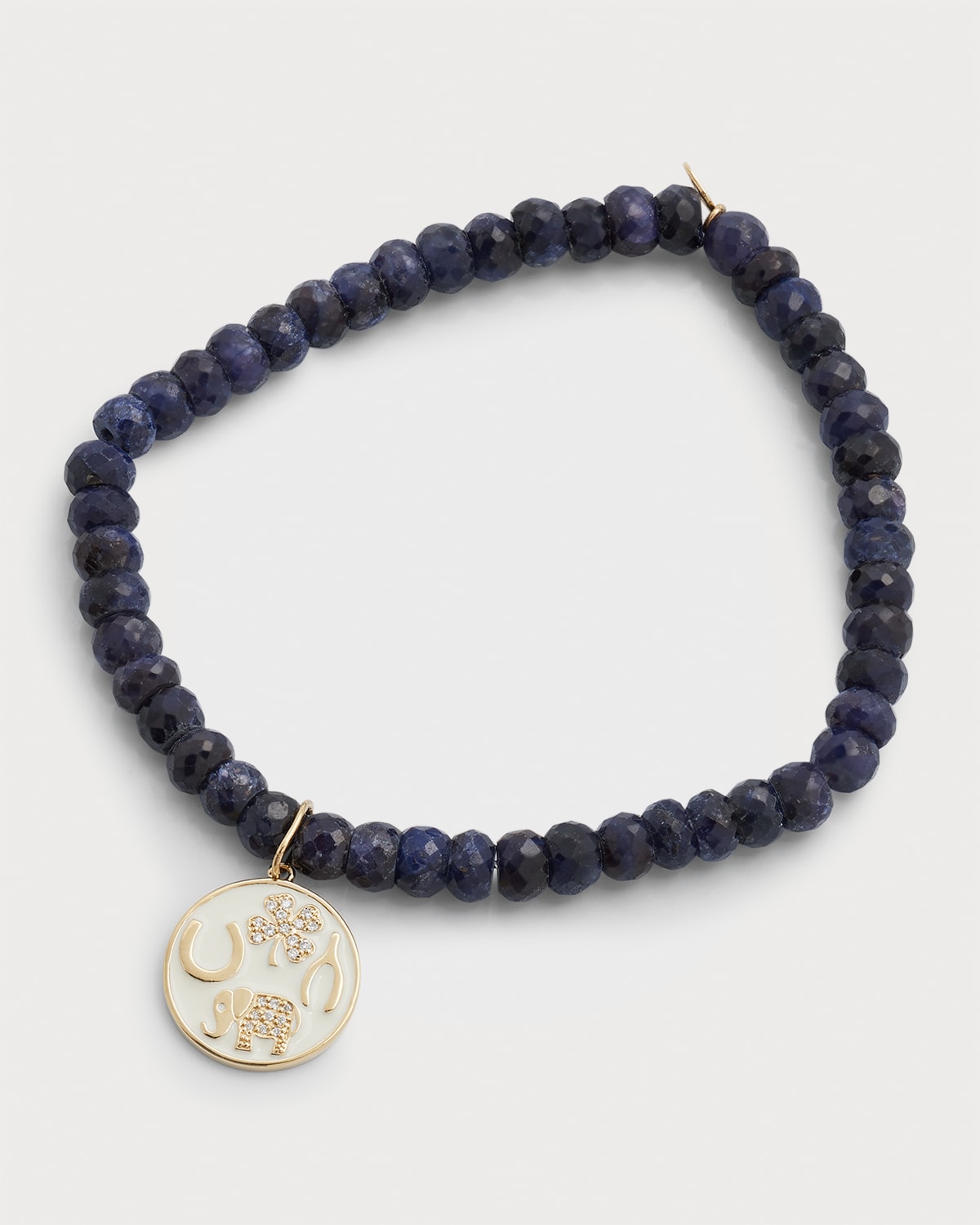 Sydney Evan bracelet Approx. 6.25" L 14karat yellow gold 6mm blue sapphire corundum faceted rondelle Luck tableau enamel medallion with diamond pavé Total diamond carat weight: 0.059 Slipon style Imported