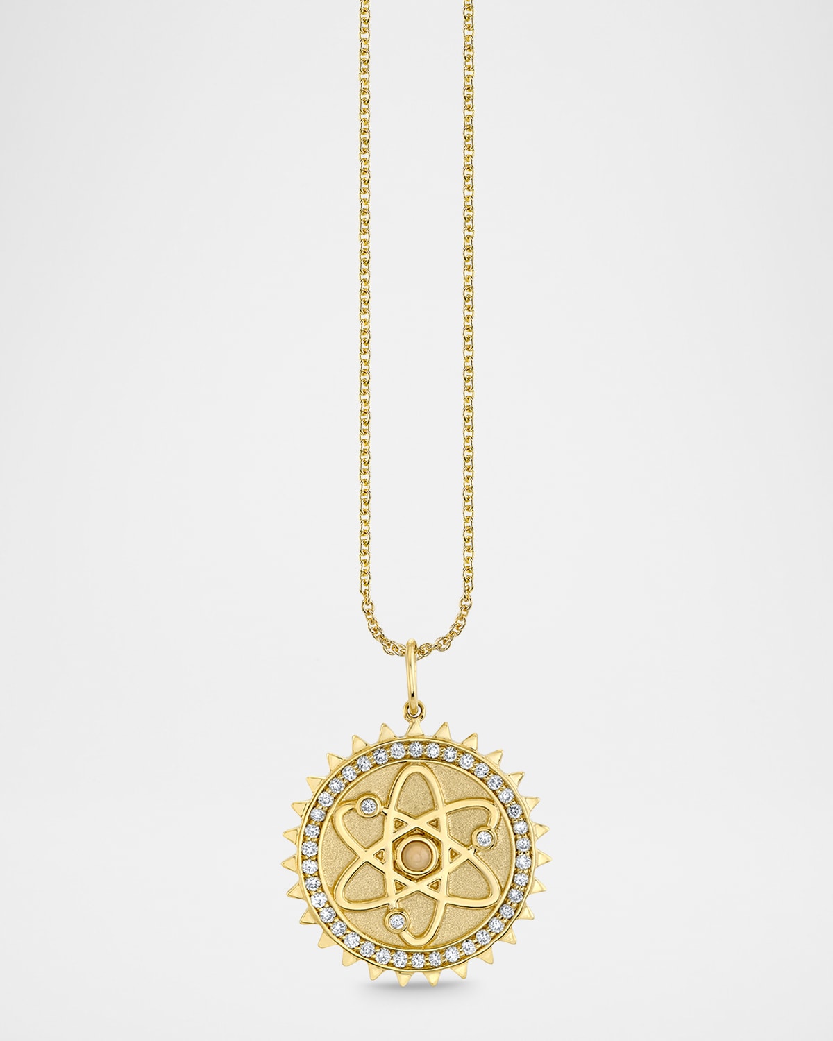 An orbiting motif is the focal point of this Sydney Evan pendant necklace. A coinedge trim and a brilliant diamond halo frame the graphic pendant. Approx. 18" length Polished 14karat yellow gold 41 HI colorless diamonds 0.22 total carat weight Adjustable length Lobster clasp Imported