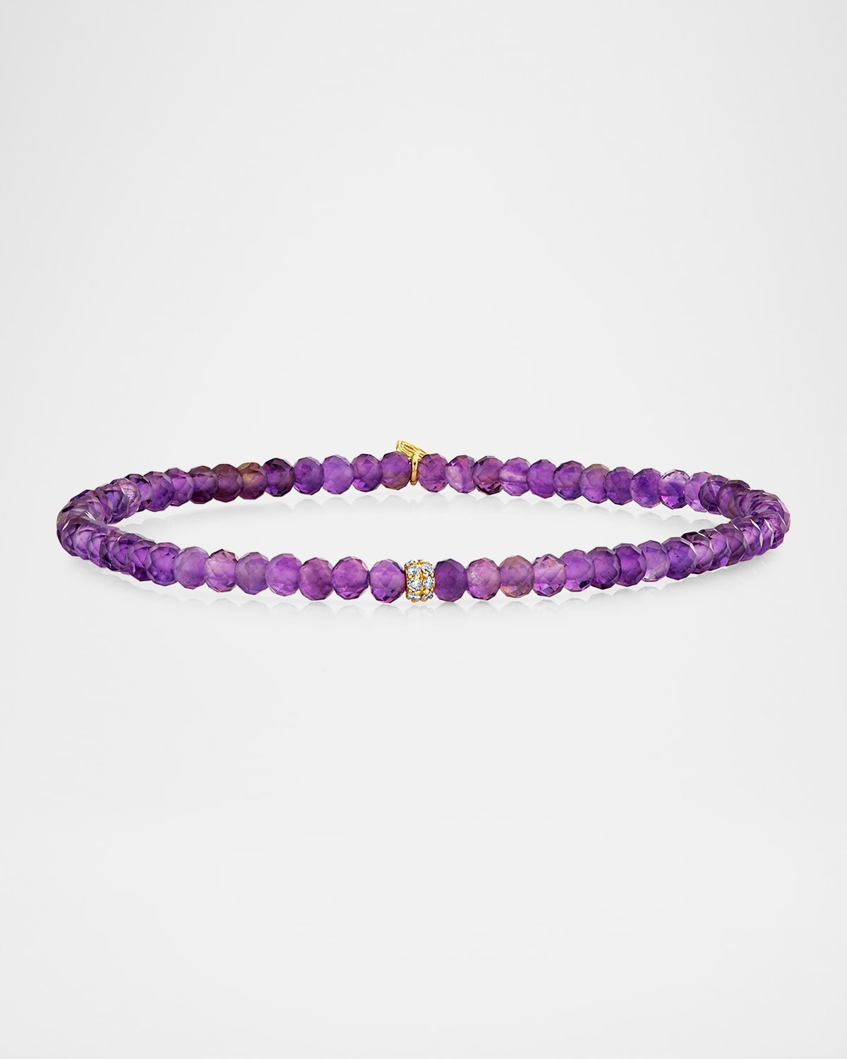 A diamond pavé rondelle bead accents this amethyst bracelet from Sydney Evan. Even as a single accent, the brilliant diamonds create a sparkling effect. Polished 14karat yellow gold Pavéset HI colorless diamonds 0.65 total diamond carat weight Faceted purple amethyst beading Stretches to fit Imported