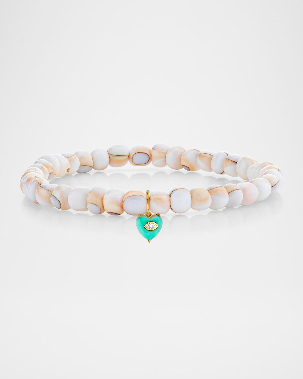 Sydney Evan combines precious and semiprecious stones for the brand's signature stretch bracelet. For example, this bracelet beaded with luanos shells is accented by a turquoise heart and diamond evil eye for extra protection. Polished 14karat yellow gold One colorless HI diamond Diamond total carat weight: 0.035 Turquoise and smooth, semiround shells 0.85 total turquoise carat weight Stretches to fit Imported