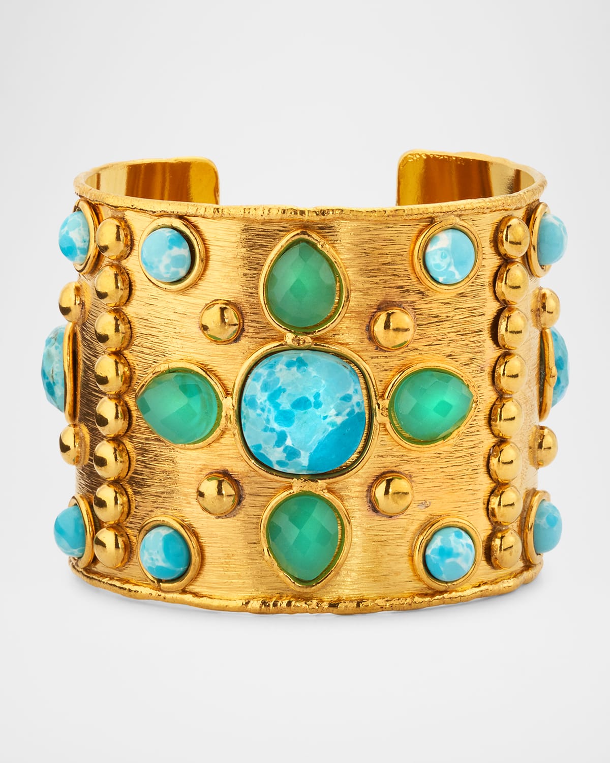 Larimar and chalcedony decorate this Sylvia Toledano cuff bracelet. Approx. 2" width 22karat goldplated brass Slipon style Imported