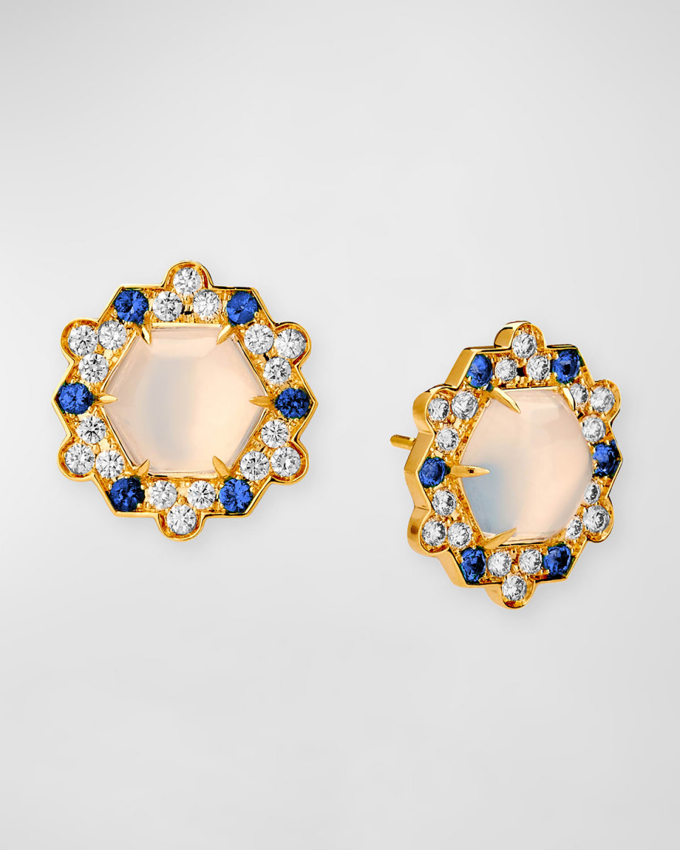 18k Mogul Hex Earrings with Moon Quartz, Sapphires and Diamonds