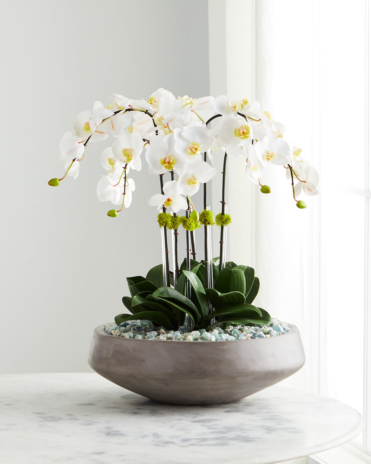 Concrete round container filled with faux white orchids, faux foliage, and crushed flourite. Approx. 21"Dia. x 27"T. Made in the USA of imported materials. Boxed weight, approximately 25 lbs.