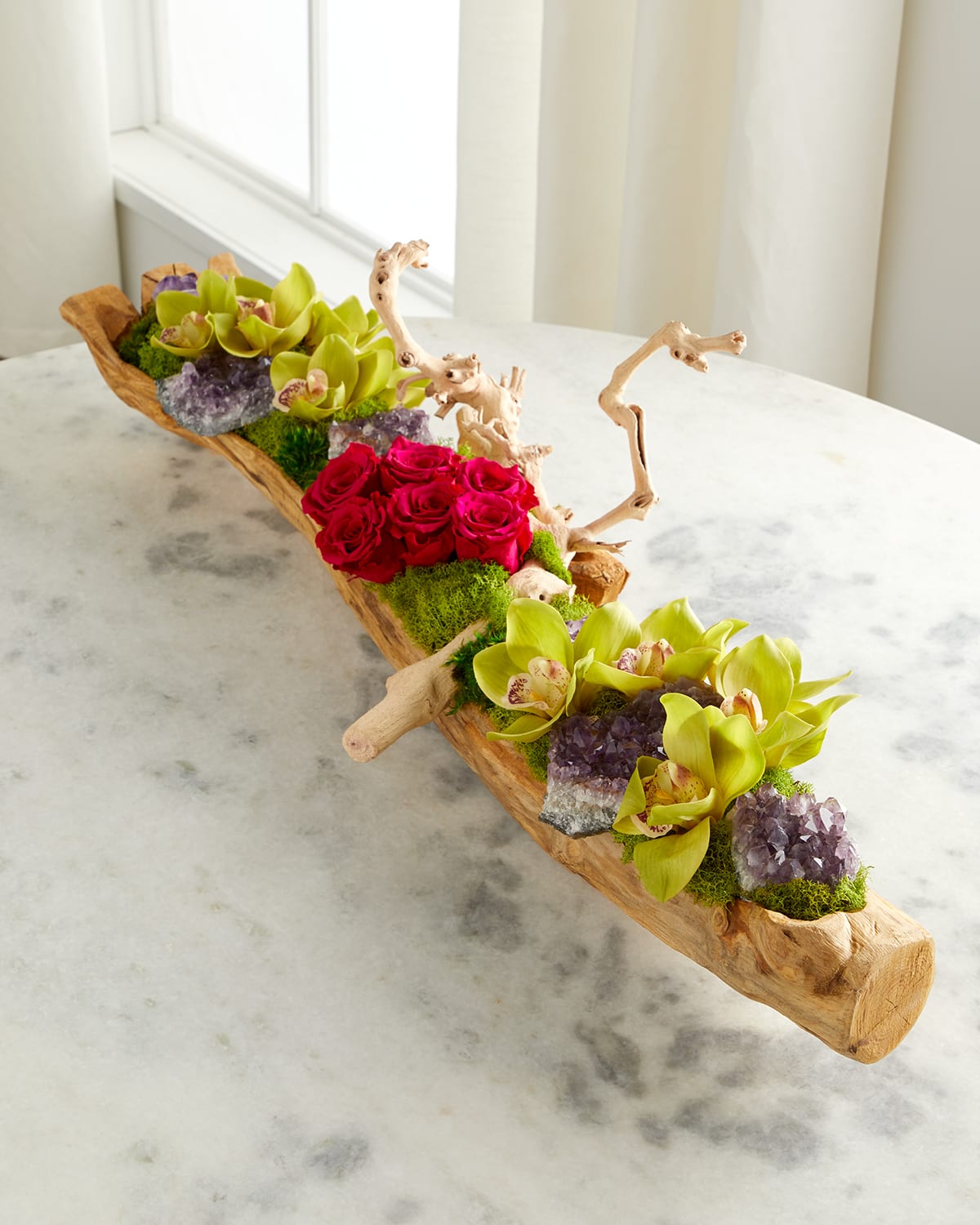 Handcarved wood log filled with amethyst and organic roses from Ecuador and finished with preserved mosses and silk orchids. 35"W x 12"D x 9"T. Organic. Made in the USA.