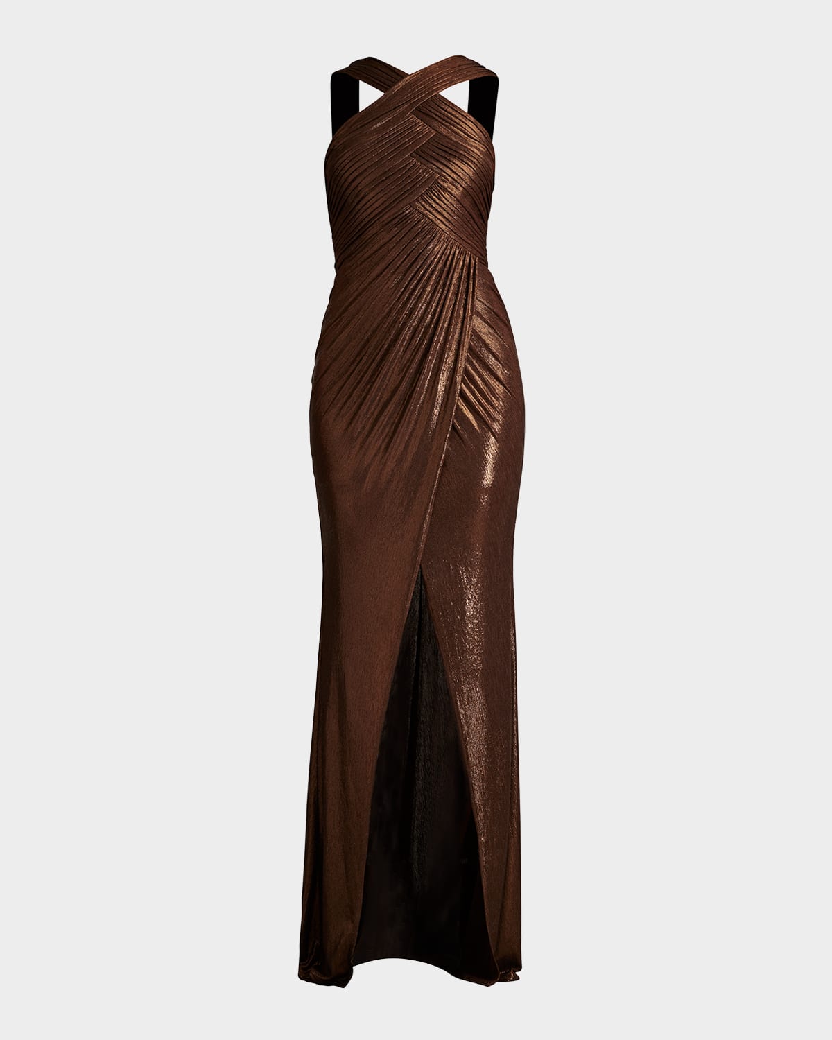 Tadashi Shoji pleated crisscross gown in metallic jersey Approx. 60"L from shoulders to hem Halter neckline Sleeveless Center front slit Full length Column silhouette Invisible back zipper Polyester/spandex Imported