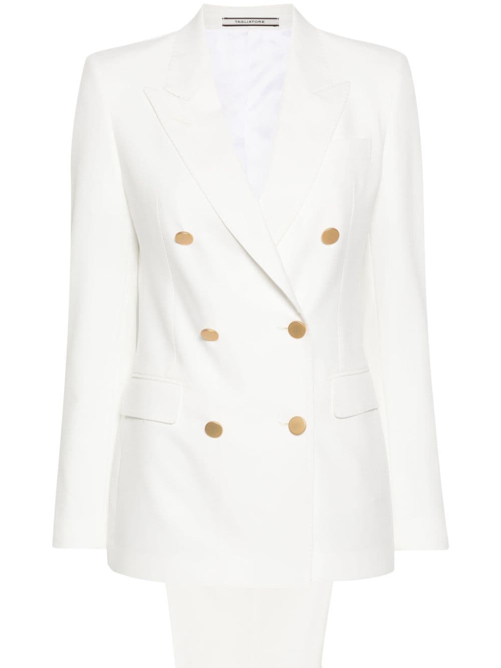 white crepe texture Jacket: peak lapels long sleeves faux buttoned-cuff sleeves chest welt pocket two front flap pockets central rear vent full lining double-breasted button fastening Trousers: pressed crease two diagonal pockets to the sides two rear welt pockets straight leg concealed front hook and zip fastening