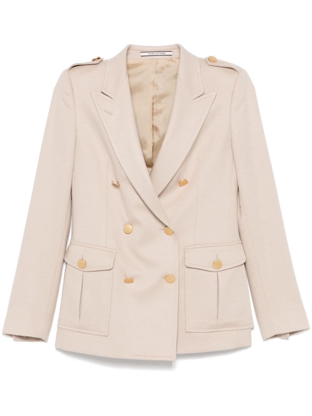 light beige cashmere brushed effect double-breasted button fastening peak lapels gold-tone buttons epaulettes shoulder pads long sleeves buttoned cuffs dart detailing two side flap pockets American rear vent satin lining straight hem