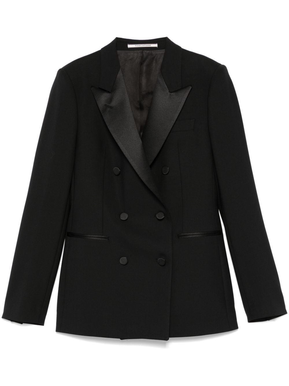 black twill weave double-breasted button fastening peak lapels shoulder pads long sleeves buttoned cuffs chest welt pocket dart detailing two side jetted pockets American rear vent satin lining straight hem