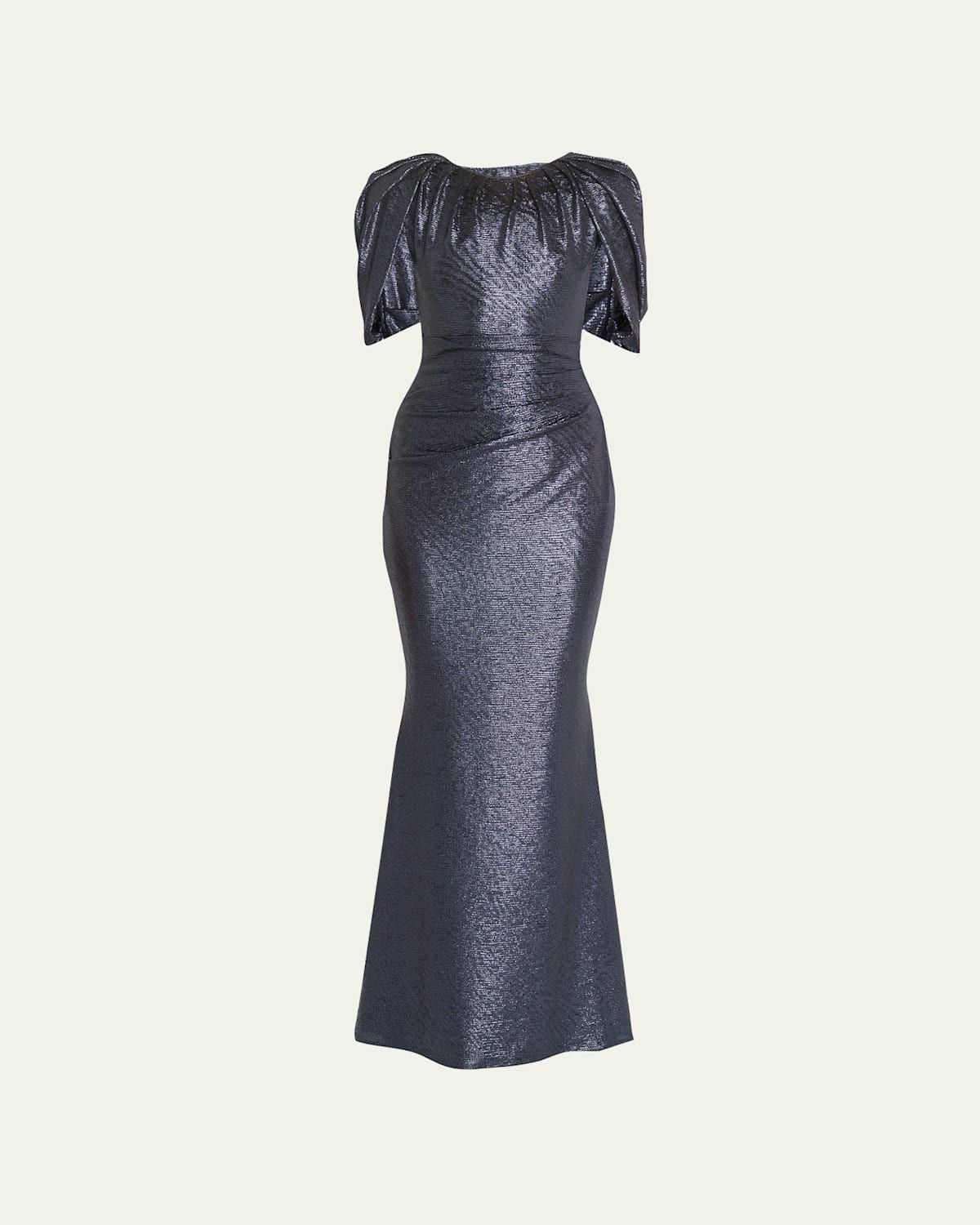 Talbot Runhof "Zebra Disco" metallic gown features capestyle sleeves and a gathered neckline Round neckline Short sleeves Concealed back zip Floorsweeping hem; small train at back Trumpet silhouette Polyester/elastane Lining: Cupro/elastane Made in Portugal