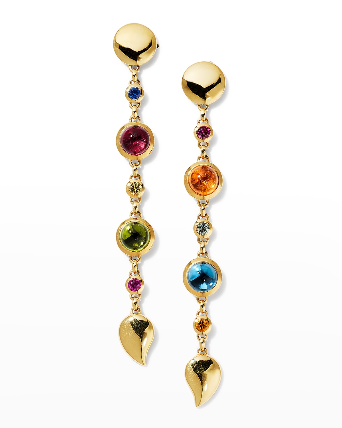Tamara Comolli earrings Approx. 3,5"L (90mm) 18karat yellow gold Blue, pink and yellow sapphires Mandarin garnet, Swiss blue topaz, pink tourmaline and peridot Peridot total carat weight: 2.2 Tourmaline total carat weight: 2.5 Topaz total carat weight: 2.9 For pierced ears Made in Germany