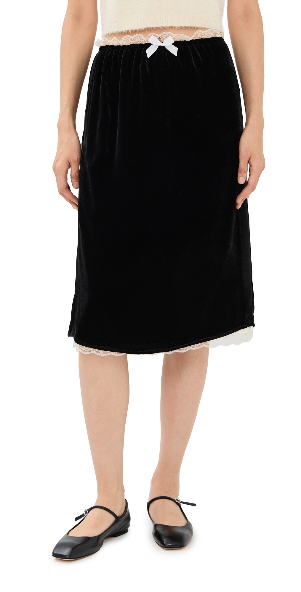 Fabric: Mid-weight, non-stretch velvet. Bow detailing at front. Lace trim. Covered elastic waistband. Shell: 82% rayon/18% silk. Lined. Lining: 100% polyester. Dry clean. Imported, China. Measurements: Measurements from size S Length: 28.75in / 73.0cm