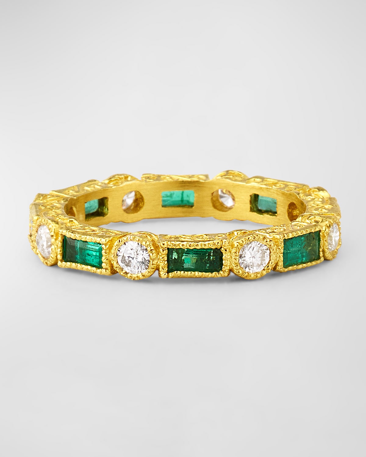 18K Yellow Gold Emerald and Diamond Eternity Ring, Size 6.5