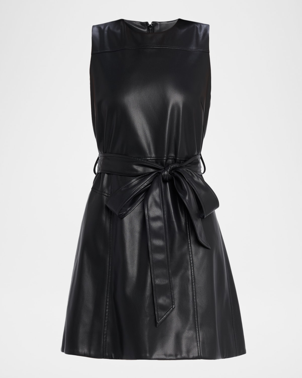 Designed with refined tonal seam detailing, the "Claudia" dress by Tanya Taylor is crafted from luscious vegan leather (PU/polyester) for an elevated daytonight look Approx. 34.5"L from shoulder to hem Crew neckline Sleeveless Selftie belt through belt loops Hem falls above the knee Sleek aline silhouette Center back zipper Polyurethane/polyester Lining: Polyester Dry clean Imported