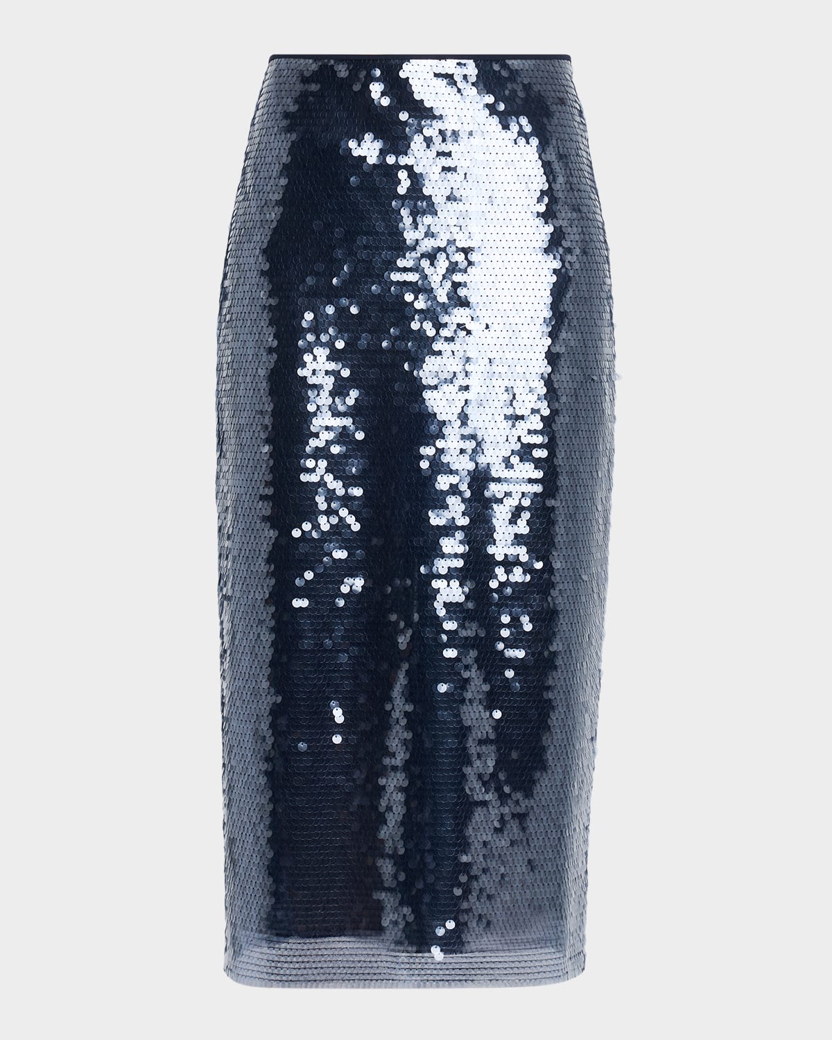 A standout piece ideal for daytonight dressing, the "Kiah" skirt by Tanya Taylor is entirely embellished with sequins High waist Centercut back slit eases movement Hem falls below the knee Skirt falls straight from hip to hem Invisible back zipper Polyester Imported