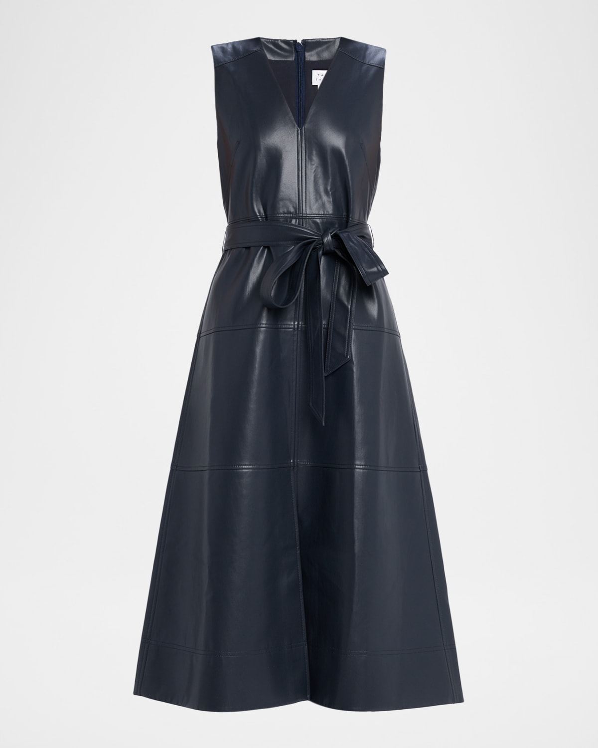 Designed for a refined and sophisticated silhouette, the "Reinella" dress by Tanya Taylor is made from luscious vegan leather (polyester) in a flattering figuregrazing fit V neckline Sleeveless Selftie belt Hem falls below the knee Aline skirt Center back zipper Polyester Imported