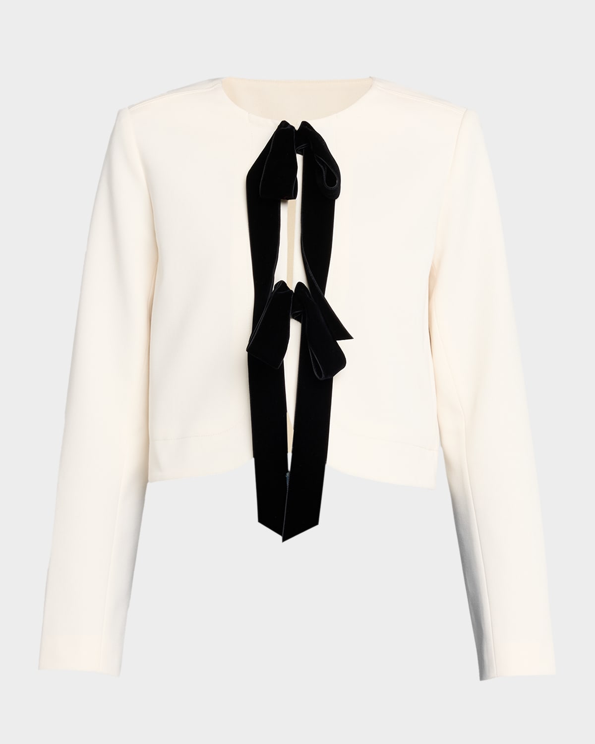 Tailored in gabardine, the "Viola" jacket by Tanya Taylor is decorated with contrasting velvet bows for a feminine touch. Crew neckline Padded shoulders Long sleeves Tailored fit Cropped length Front hook closure Polyester/rayon/cellulose acetate/spandex Dry clean only Imported