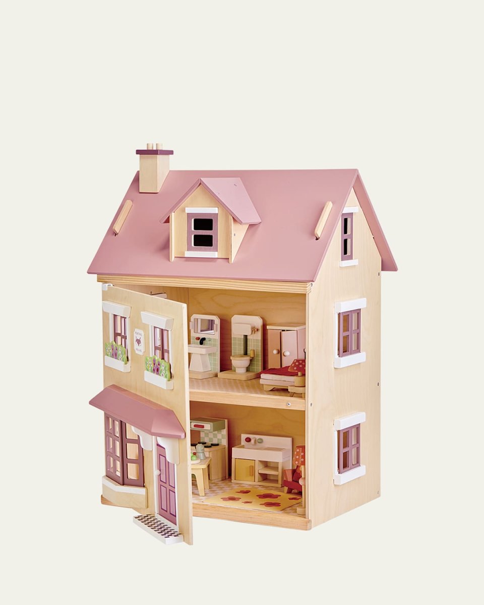 The Foxtail Villa from Tender Leaf Toys is the perfect townstyle doll house. The subtle colors and FSC plywood fascia make this a beautiful midsize doll house for any little boy or girl. Approx. 17.3L" x 12.8"W x 28"H Included starter set of matching furniture Recommended for ages: 3+ Item Weight (Lbs.): 15.4 Selfassembly required Dolls sold separately Plywood/cotton/cotton Wipe clean Imported
