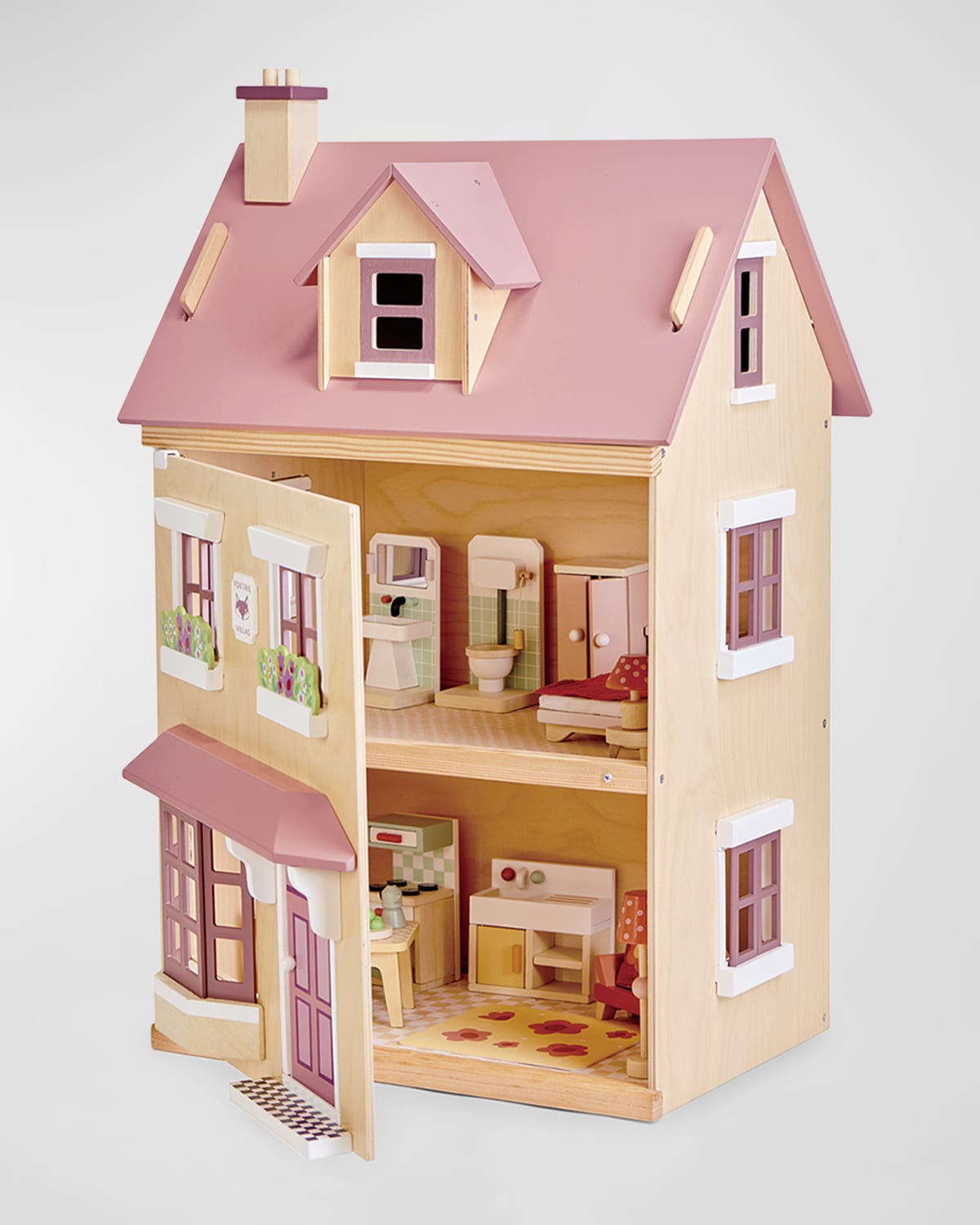 The Foxtail Villa from Tender Leaf Toys is the perfect townstyle doll house. The subtle colors and FSC plywood fascia make this a beautiful midsize doll house for any little boy or girl. Approx. 17.3L" x 12.8"W x 28"H Included starter set of matching furniture Recommended for ages: 3+ Item Weight (Lbs.): 15.4 Selfassembly required Dolls sold separately Plywood/cotton/cotton Wipe clean Imported
