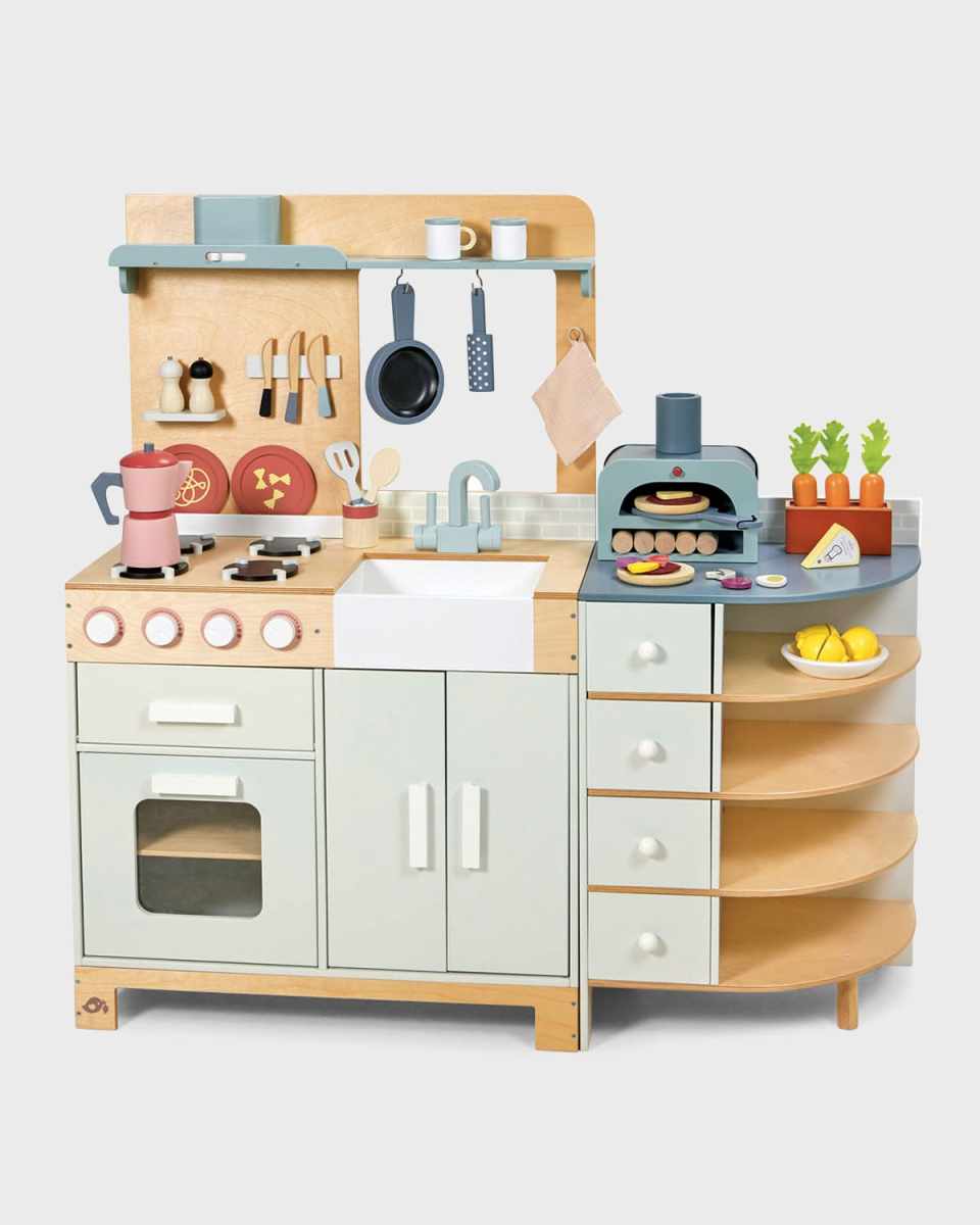 Tender Leaf Toys "La Fiamma" play kitchen A twopart kitchen sink, and cooker with backboard, and a storage unit with pizza oven. Unit includes oven and grill with 4 clacking buttons, and double door storage unit under the sink. Approx. 39.8"H x 12.8"W x 39.4"D Recommended for ages: 3+ Item Weight (lbs.): 57.6 Wood/plywood/fabric Wipe clean Imported