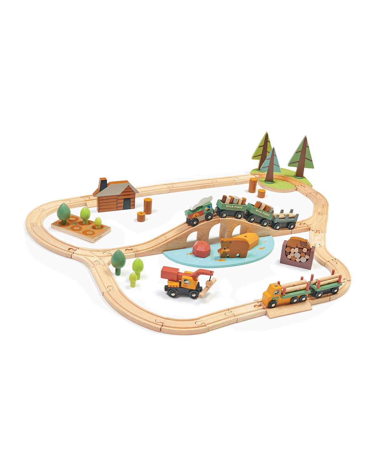 This 30piece track allows for creative layouts and endless storytelling. Accessories that move include: 3 carriages holding 27 small logs, a logging truck carrying 9 timbers with magnetic pots, a loader vehicle that can magnetically pick up the logs and load up the truck. Also included: 1 log pile to hold the logs with a sleeping bear, 3 big fir trees that can block the track unless rotated out of the way, 4 cut timber logs and a tree nursery with 6 trees in various stages of growth. Recommended for ages: 3+. Wood. Imported.