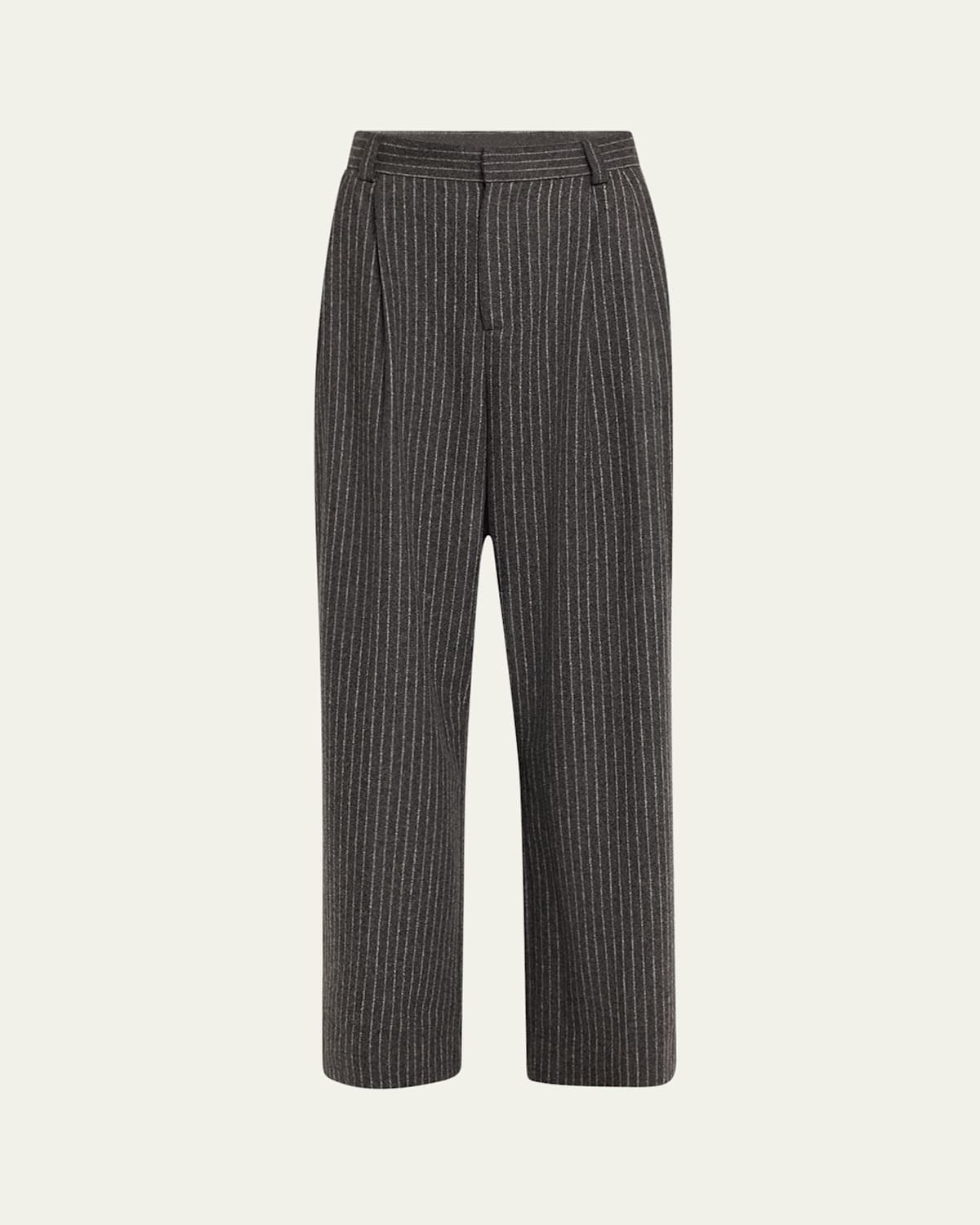 TEURN STUDIOS woolblend trousers featuring a pinstripe motif Midrise; sits high on the hip Pleated front Side pockets; single back pocket Relaxed fit Full length Hook/zip fly; belt loops Virgin wool/nylon/polyamide Imported
