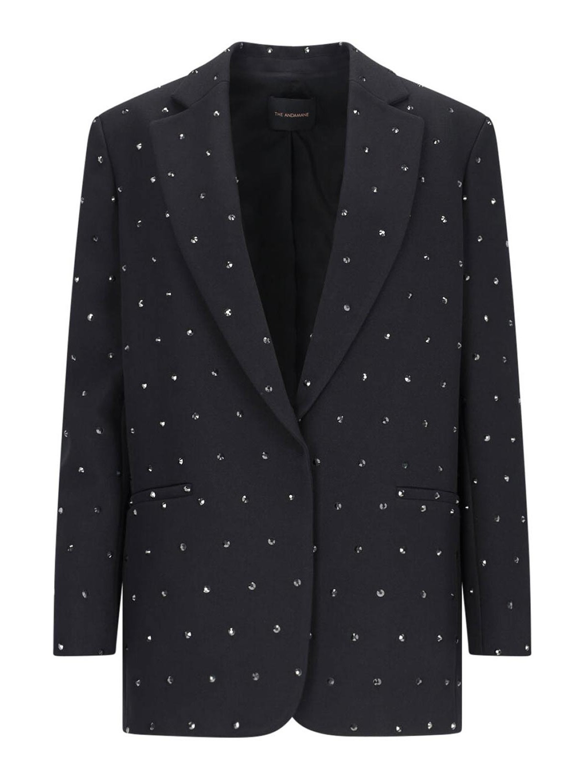 Blazer avec motif Andaman noir appliqué sur l'ensemble, revers classiques boutonnés, deux poches passepoilées latérales, ourlet droit