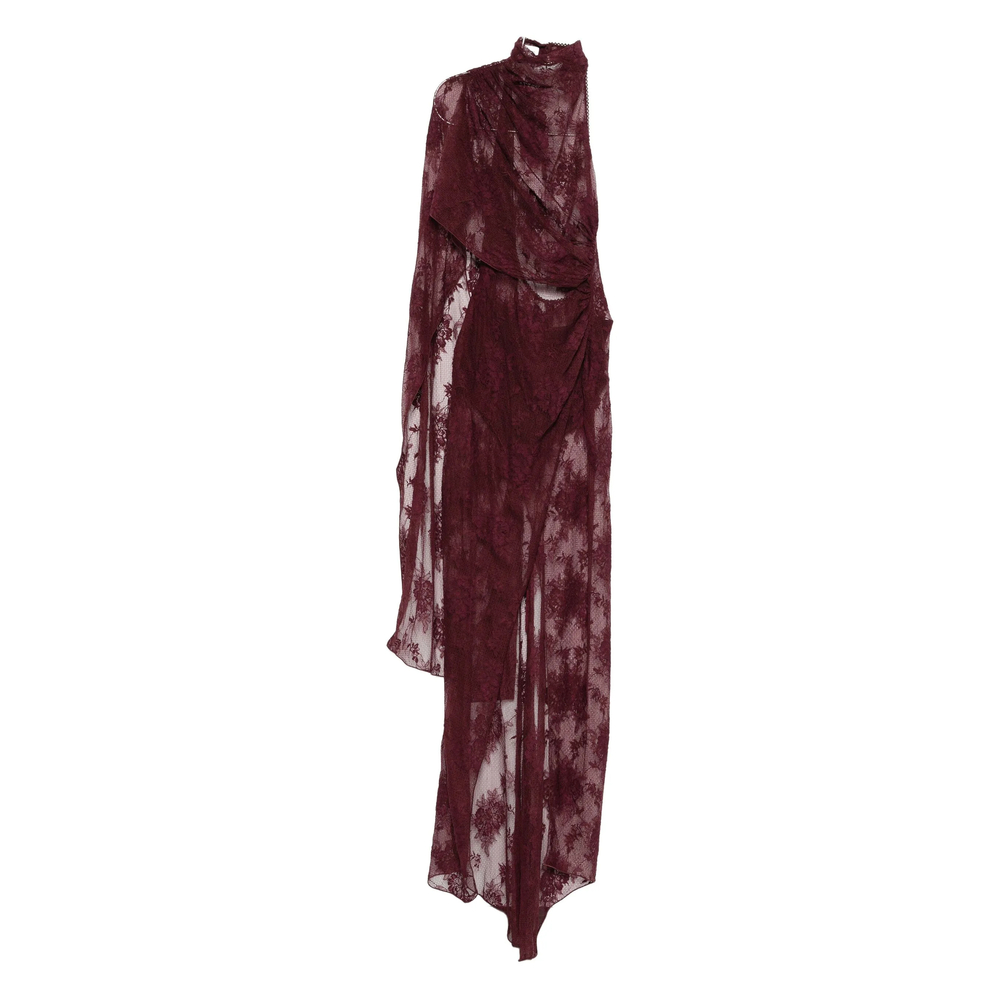 dark red lace detailing draped detailing high neck asymmetric hem sheer