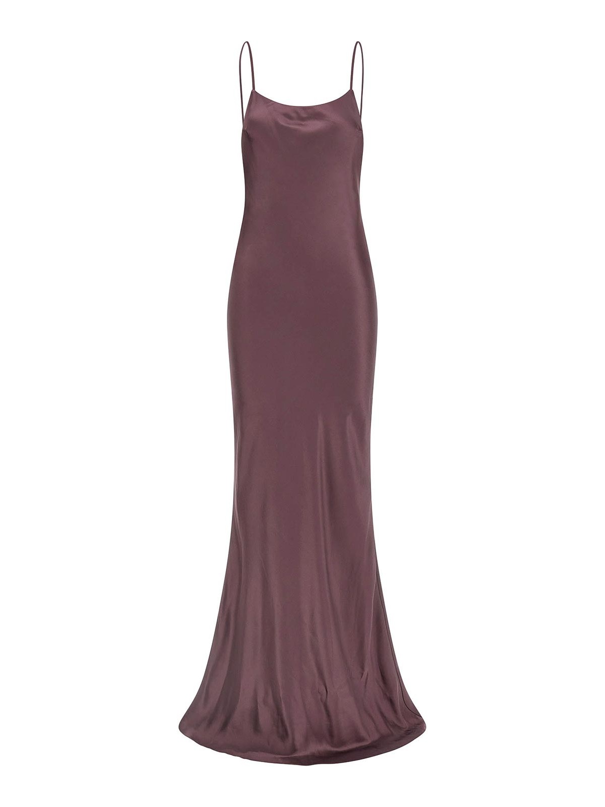Robe longue « ninfea » en satin liquide, encolure carrée sur le devant, fines bretelles, sans manches, jupe sirène à traîne légère, encolure ronde profonde dans le dos avec boucle.