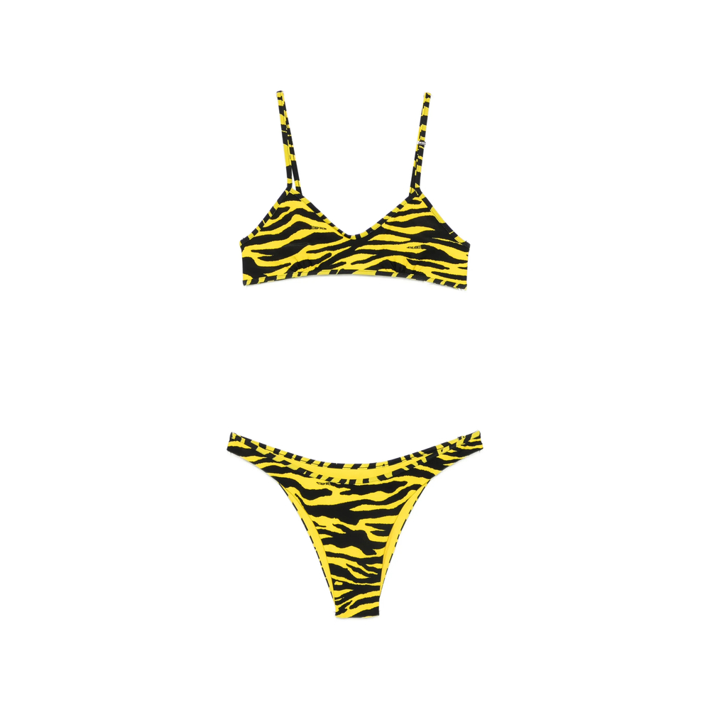 yellow and black tiger print V-neck adjustable shoulder straps logo-engraved hardware high-cut leg stretch fit Be mindful to try on swimwear over your own garments.