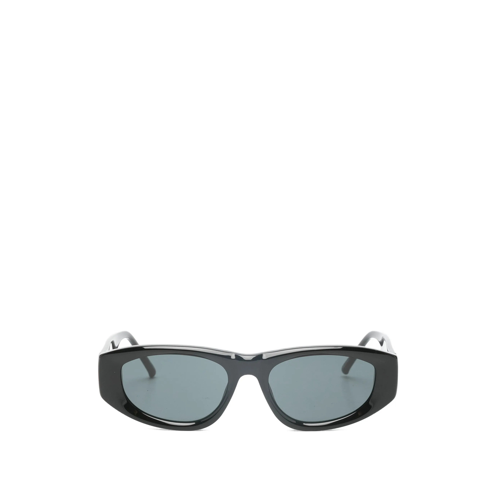 black oval frame logo detail tinted lenses nose pads These glasses come with a protective case.