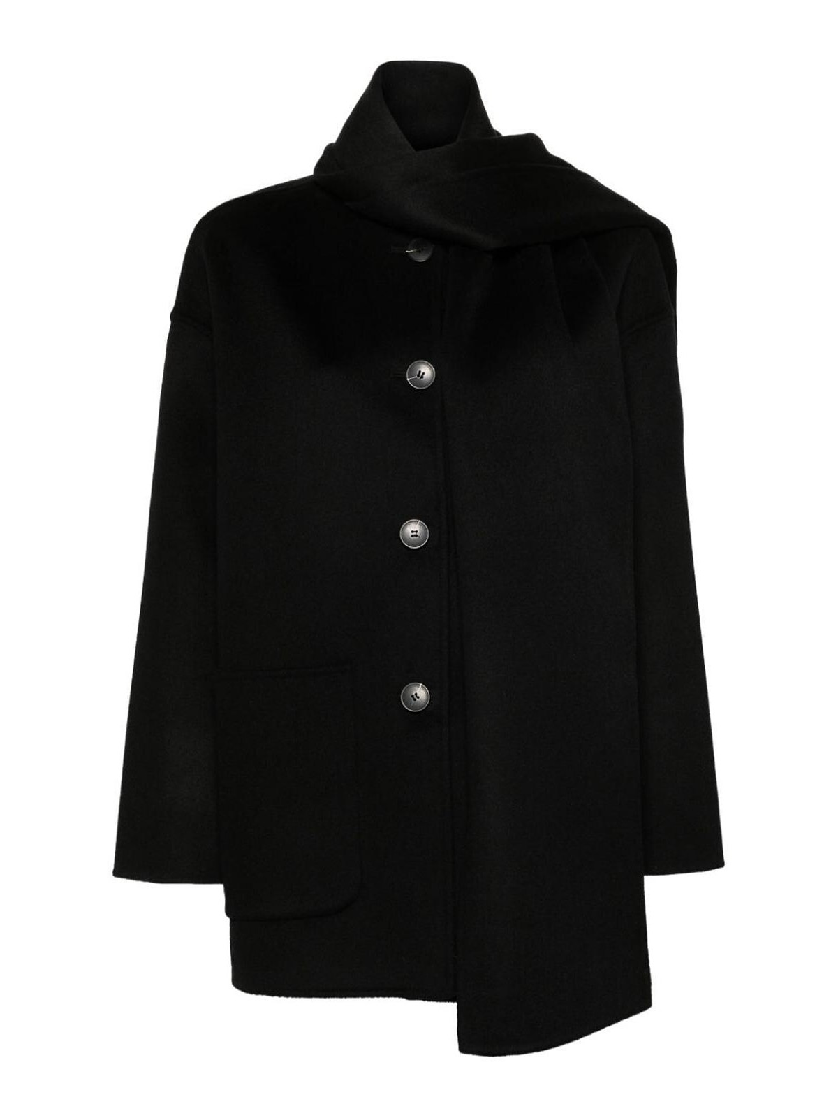 Écharpe à effet peigné, effet chiné, devant boutonné, encolure ronde, manches à épaules tombantes, manches longues, deux poches latérales plaquées sans fentes d'aération, ourlet droit.