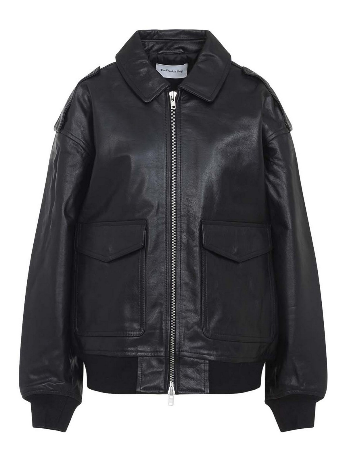 Veste The Frankie Shop Black Viper Veste noire, col pointu, rabat latéral zippé, poches boutonnées, bretelles ton sur ton sur les épaules, manches longues, poignets et ourlet côtelés, ourlet entièrement droit