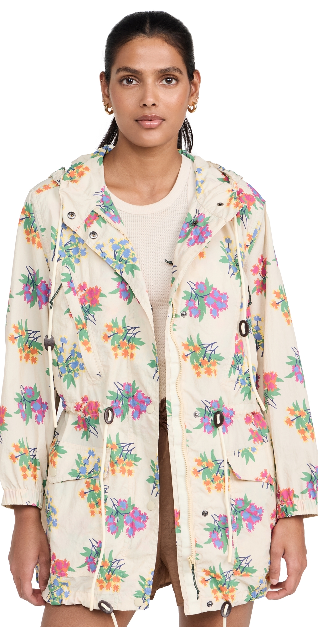 Fabric: Lightweight, non-stretch technical weave. Floral print. Drawstring hood. Long sleeves with elastic cuffs. Snap flap and hidden zip placket. Drawstring at waist and hem. Zip breast pockets and flap front pockets. Shell: 100% nylon. Unlined. Wash cold. Imported, Indonesia. Measurements: Measurements from size XS Length: 32.25in / 82.0cm, from shoulder