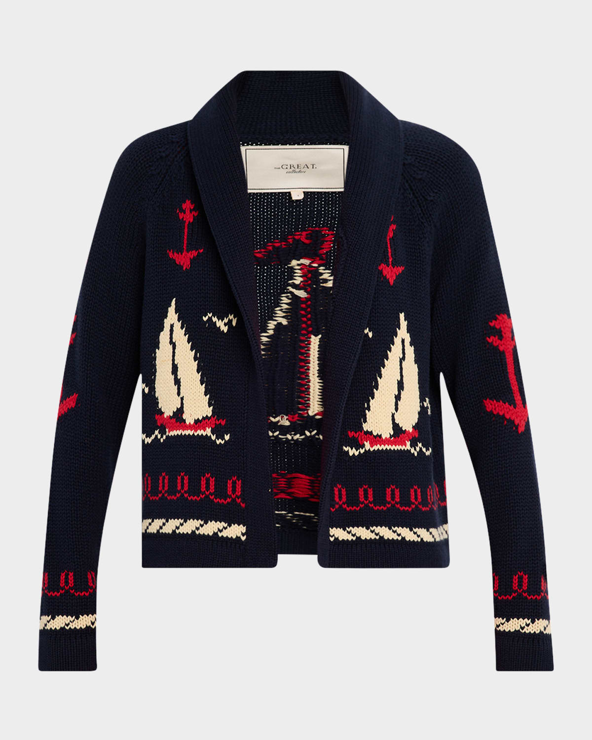 The Great "Sailboat Lodge" cardigan with sailboat intarsia Shawl collar; open front Long sleeves Relaxed fit Ribbed cuffs and hem Cotton/acrylic Imported