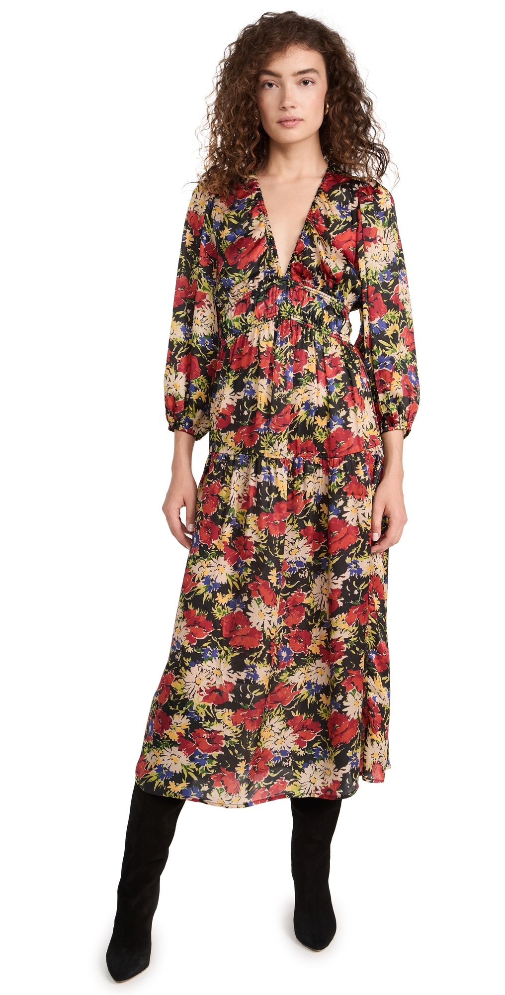 Fabric: Lightweight, non-stretch satin. Floral print. V neck. Long sleeves with elastic cuffs. Covered elastic waistband. Shell: 100% viscose. Dry clean. Imported, Indonesia. Measurements: Measurements from size 0 Length: 50in / 127.0cm, from shoulder