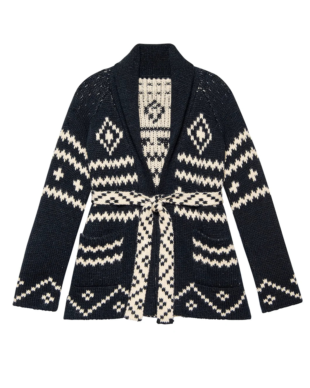 The Reversible Shepherd Cardigan in Wool Blend in the colors Navy and Cream by The Great. is a longer-length shawl that features raglan sleeves, no front closure, a removable waist tie and spun from alpaca in a double jacquard technique for full reversibility. Your perfect cozy shawl. Material: 50% Alpaca, 30% Acrylic, 15% Recycled Polyamide, 5% Wool Details: Normal Fit. Imported. Fit: The model is 5'10 and wearing a size Small (1). Style it with: A mini handbag and midi boot. Care: Dry clean only #S514742