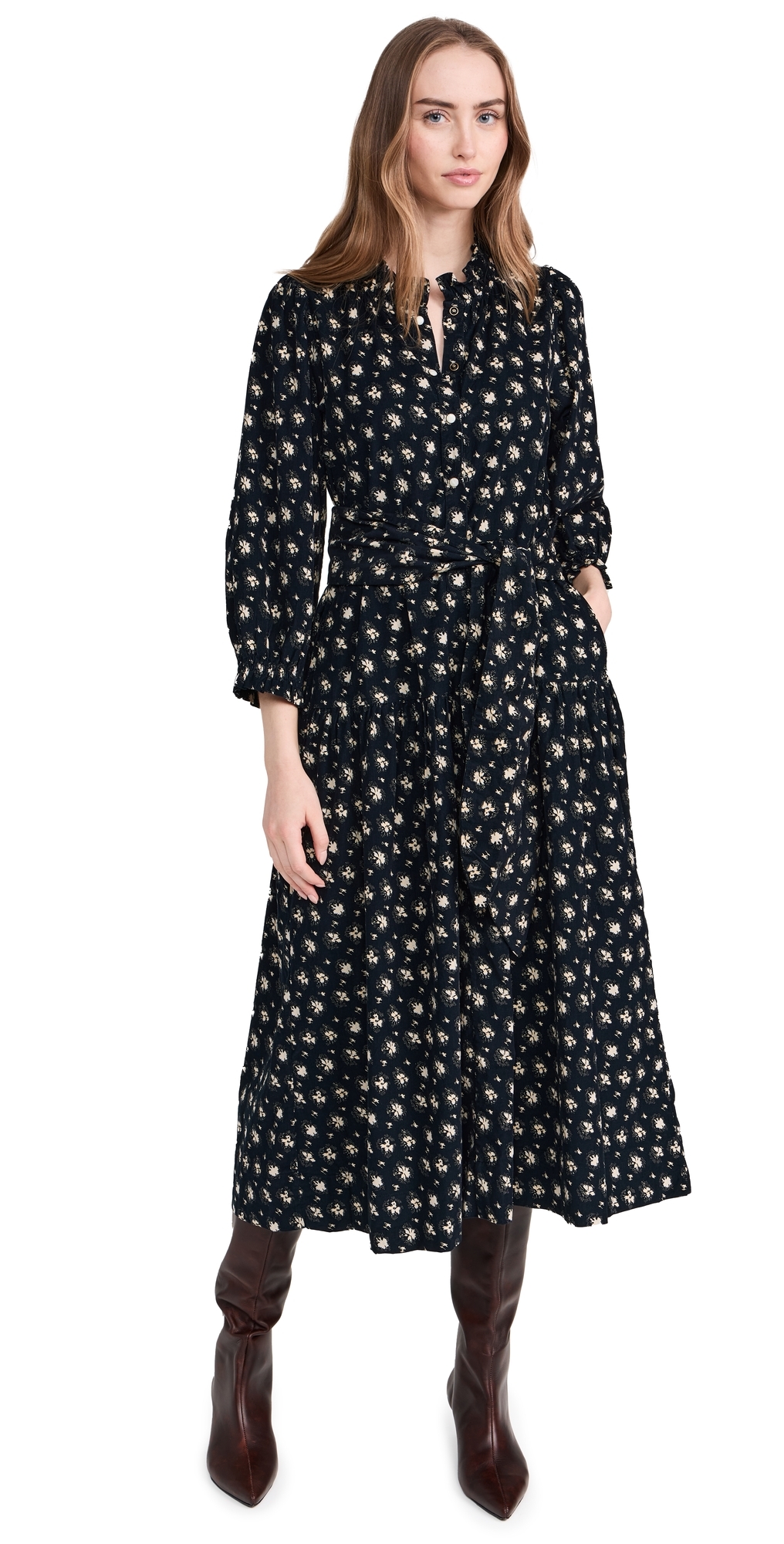 Fabric: Mid-weight, non-stretch corduroy. Leaf print. Drop waist. Ruffled edges. Crew neck. Long puff sleeves with elastic cuffs. Partial snap placket. On-seam side pockets. Shell: 100% cotton. Unlined. Dry clean. Imported, India. Measurements: Measurements from size 0 Length: 47.25in / 120.0cm, from shoulder
