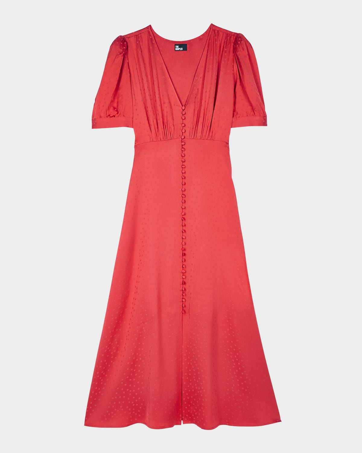 The Kooples satin midi dress featuring a buttonfront and tonal polkadot motif V neckline Short puff sleeves with button cuffs Empire waist Hem falls below the knee Viscose Lining: Viscose Hand wash or dry clean Imported
