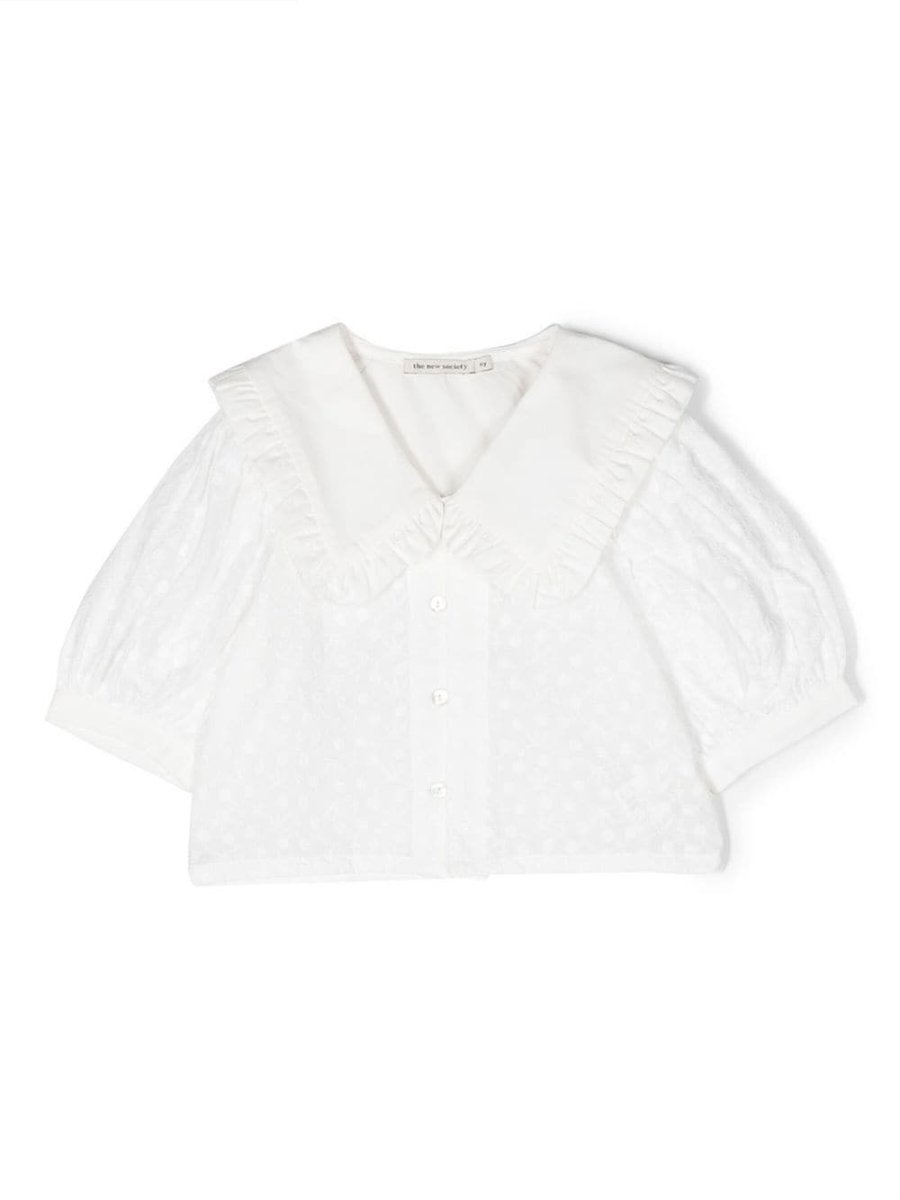 off-white cotton polka dot print V-neck puritan collar front button fastening short puff sleeves straight hem