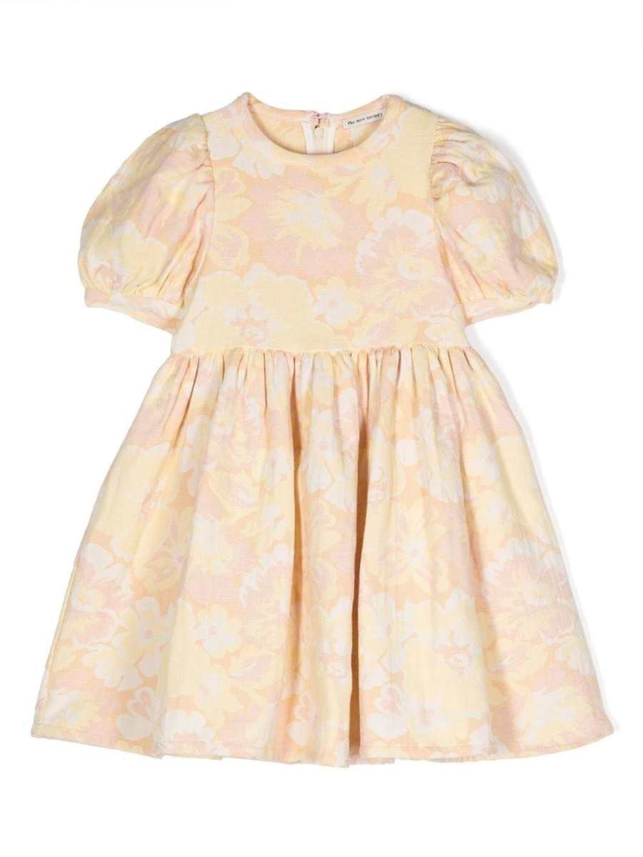 yellow/multicolour organic cotton all-over floral embroidery ruched detailing flared design round neck short puff sleeves concealed rear zip fastening