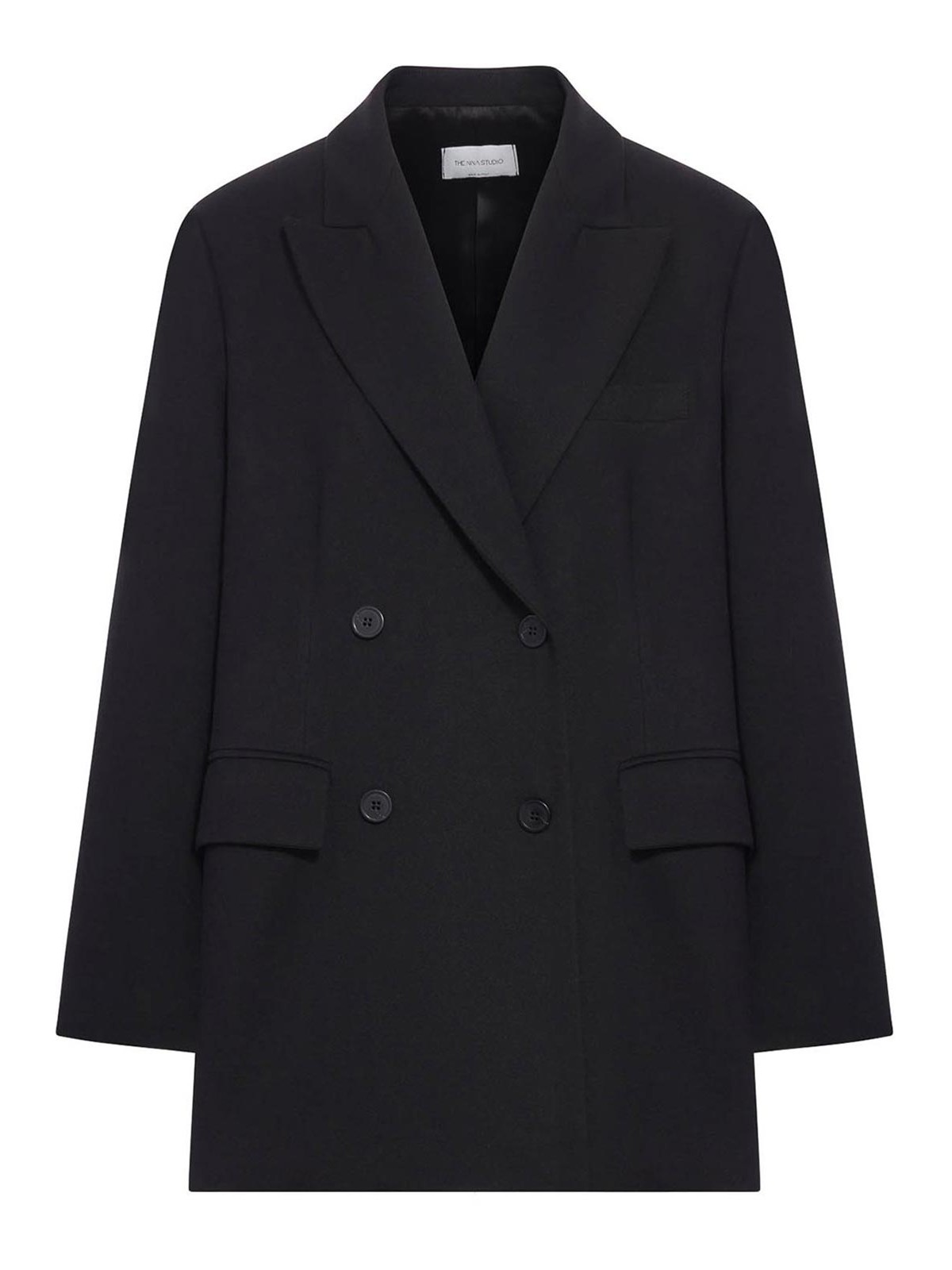 Revers à pointe classiques- épaules structurées- fermeture avant avec boutons ton sur ton- deux poches à rabat à l'avant- une poche passepoilée sur la poitrine- manches longues- poignets avec boutons décoratifs- fente arrière- doublée- couleur noire