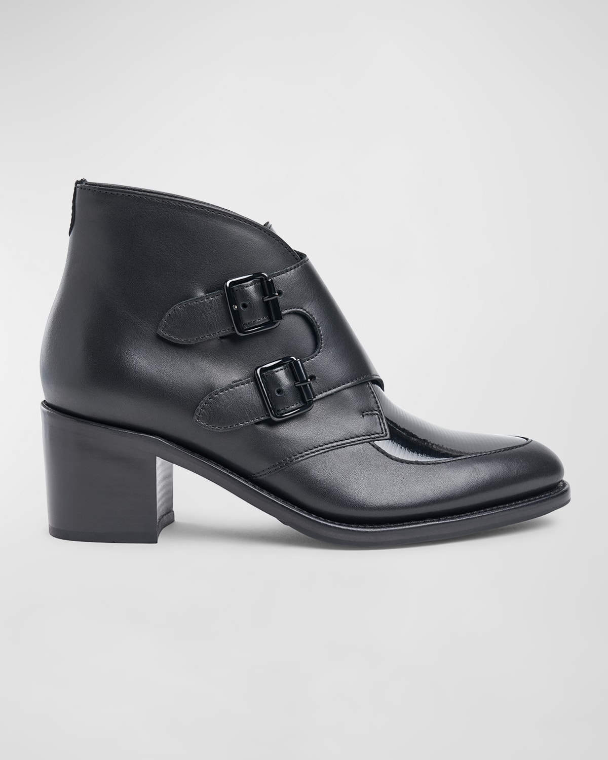 The Office of Angela Scott "Miss Joan" black Italian soft leather boots with striped patent tongue 2.50 in / 60 mm block heel Almond apron toe Double monk buckle strap Leather/Rubber outsole Lining: Leather Made in Portugal