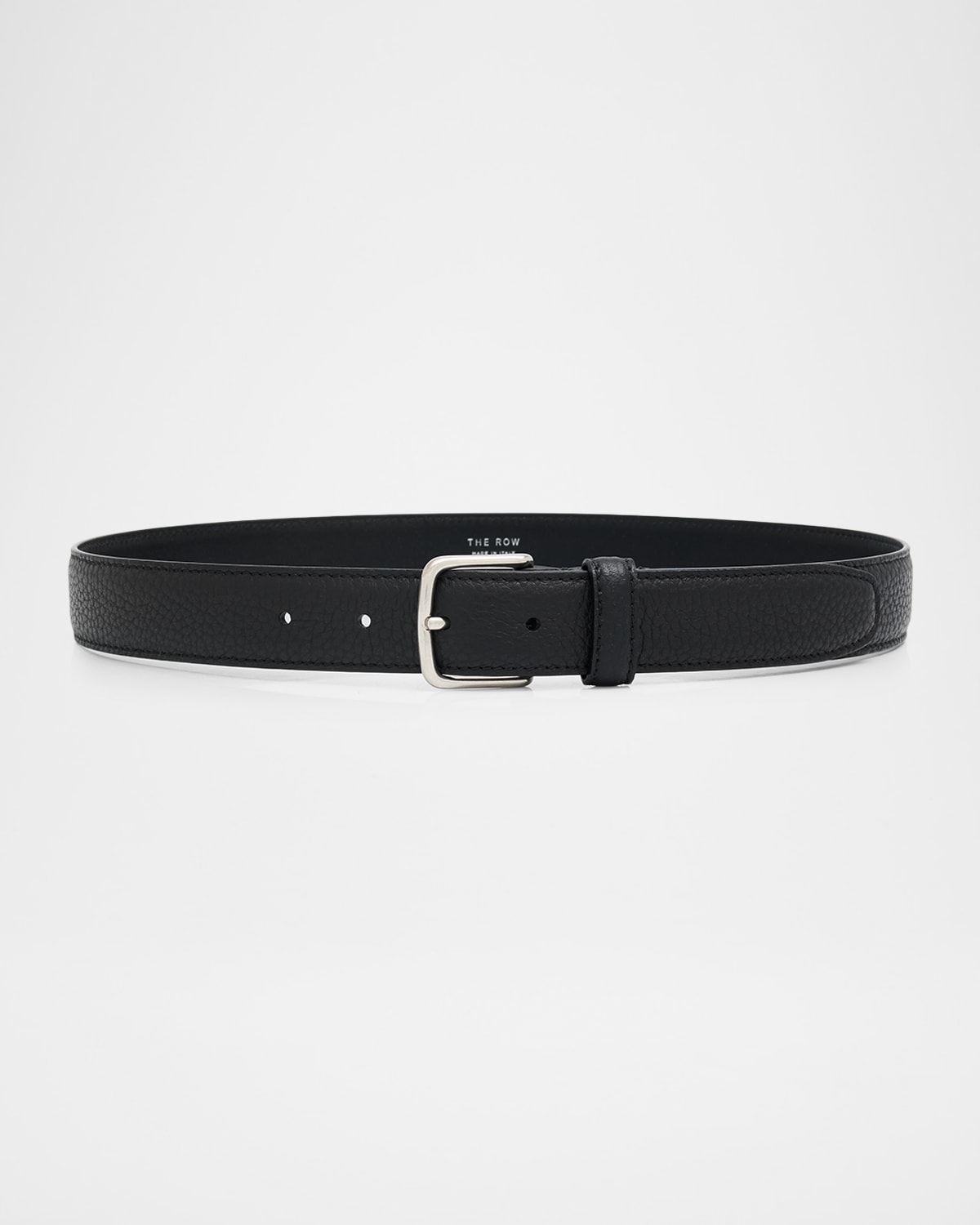 THE ROW classic belt is crafted of a pebbled calfskin leather Silvertone hardware Tapered end Topstitching Medium width Adjustable fit Leather/metal Made in Italy