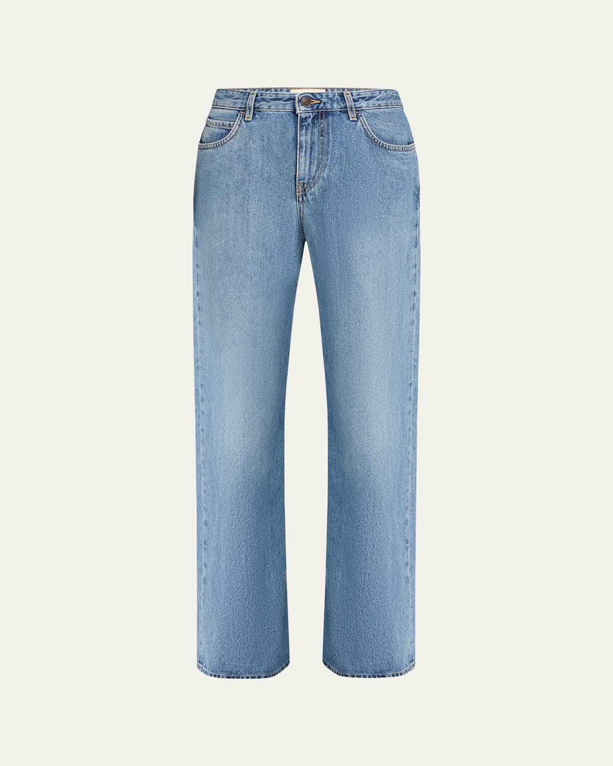 THE ROW "Eglitta" washed denim pants Low rise Cropped at the ankle Straight legs Fivepocket style Button/zip fly; belt loops Cotton/polyester Made in Italy
