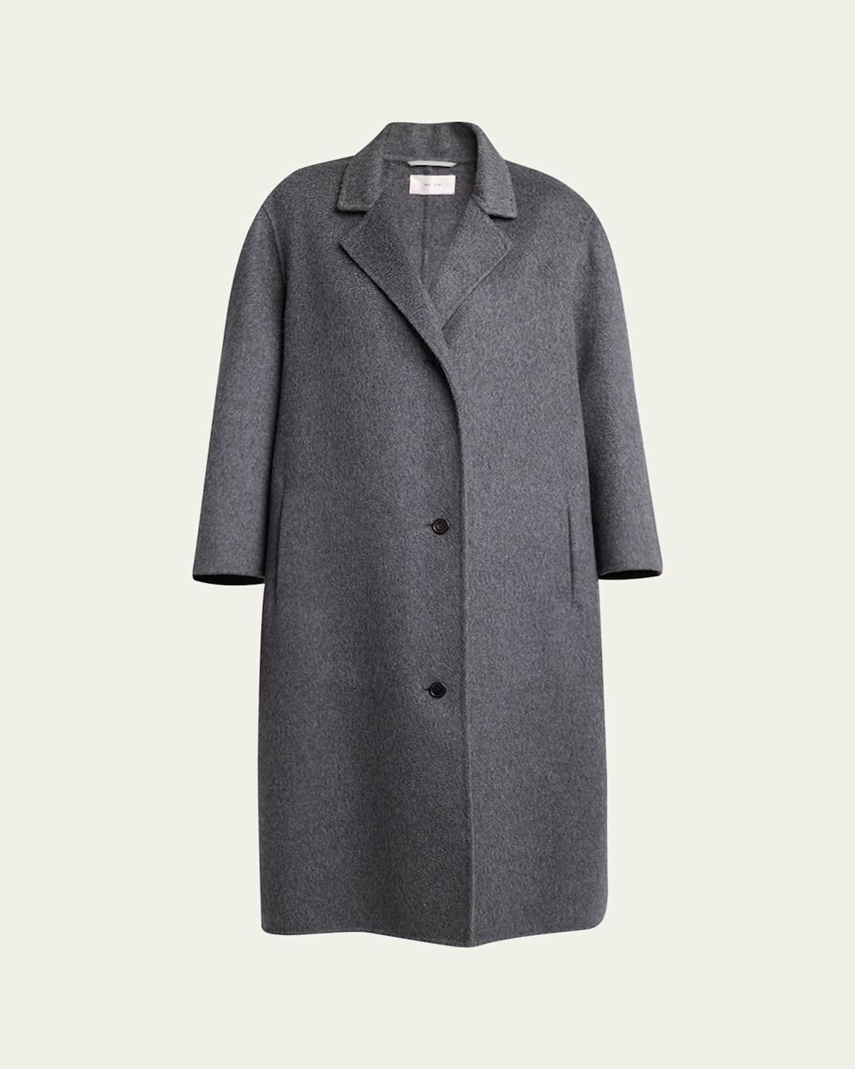 THE ROW "Gustaf" coat in brushed cashmere Notch lapels; singlebreasted front Long sleeves Side split pockets Oversized fit Hem falls below the knee Cashmere/silk Made in Italy